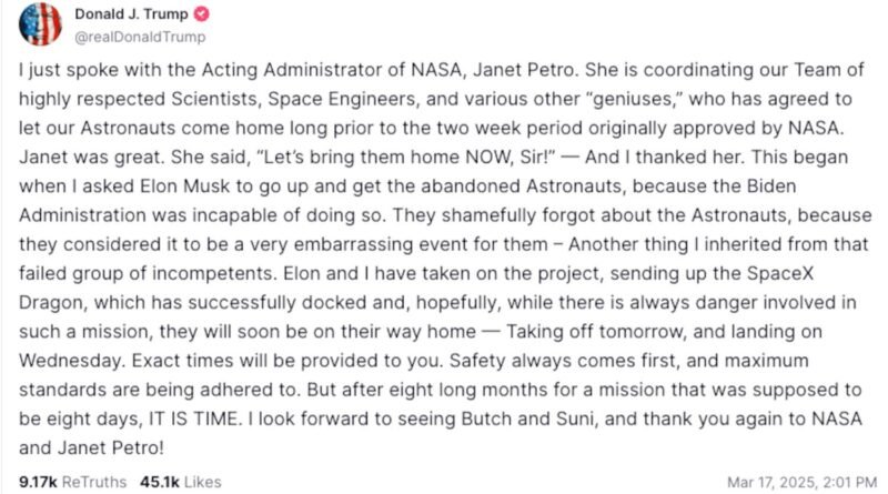 Starliner hikayesi artık sona eriyor ve NASA astronotları Suni Williams ve Butch Wilmore, dokuz aylık uzun bir uzay görevinden sonra