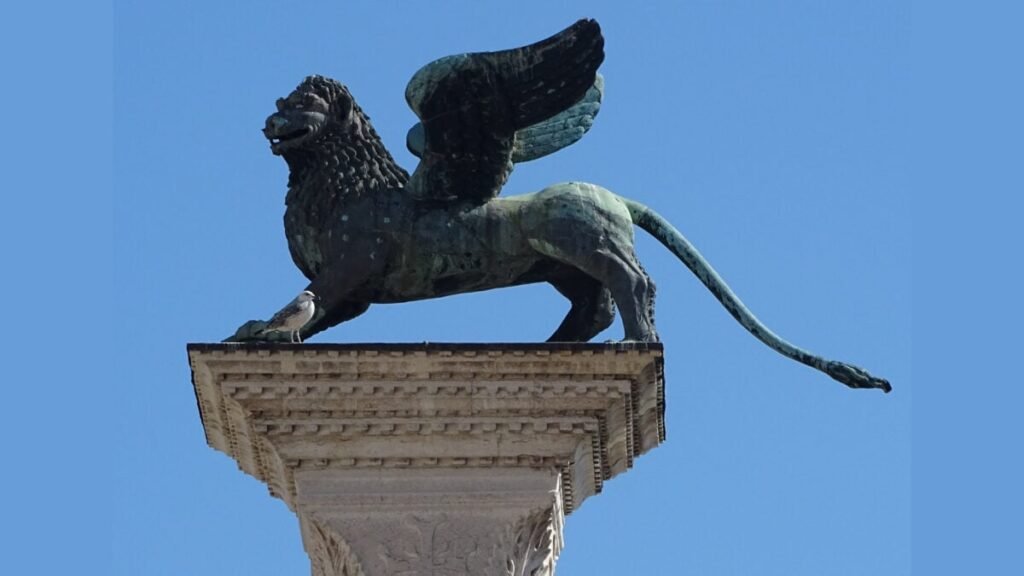 Venedik’in en ikonik simgelerinden biri, Piazza San Marco’daki (San Marco Meydanı) sütunların üzerinde duran kanatlı aslan heykelidir. Bu heykel, Venedik Cumhuriyeti bayrağında da yer alır.